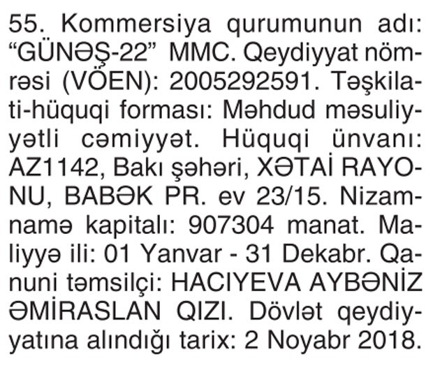 “Marja” “Vergilər” qəzetinə istinadən xəbər verir ki, “Günəş-22” MMC adlanan şirkətin qanuni təmsilçisi Aybəniz Hacıyevadır.