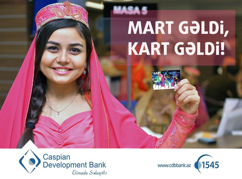 Bildiyimiz kimi, Mart ayı bayramlar ayıdır. Bayramların qeyd edilməsi, hədiyyələrin alınması, səfərlər və s. müəyyən xərclər tələb edir. İndi bu xərclərin ödənilməsinin alternativ yolu var. Belə ki, “KartMart” 8 Mart Beynəlxalq Qadınlar Günü və Novruz Bayramı ilə əlaqədar xərclərin qarşılanması üçün nəzərdə tutulan bir kartdır. Kartdan istifadə olunmuş məbləğə ilk 30 gündə faiz hesablanmır. “CDB Bank” kartınıza 2000 manata qədər məbləğ yatırır və siz bu məbləği xərcləyib 30 gün ərzində geri ödəsəniz heç bir faiz ödəmirsiniz. Əgər vəsait 30 gün ərzində geri ödənməsə, istifadə edilmiş məbləğin üzərinə faiz hesablanır. Bu faiz də digər banklarda olduğu qədər yüksək deyil. Bu barədə daha ətraflı məlumat verəcəyik.