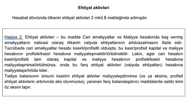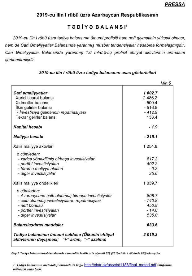 "2019-cu ilin I rübü üzrə tədiyə balansının ümumi profisiti həm neft qiymətinin yüksək olması, həm də Cari Əməliyyatlar Balansında (CƏB) yaranmış müsbət tendensiyalar hesabına formalaşmışdır. Cari Əməliyyatlar Balansında yaranmış 1.6 mlrd.dollarlıq profisit ehtiyat aktivlərinin artmasını şərtləndirmişdir