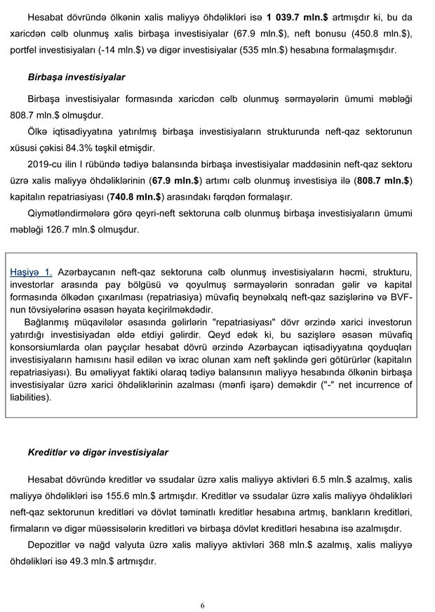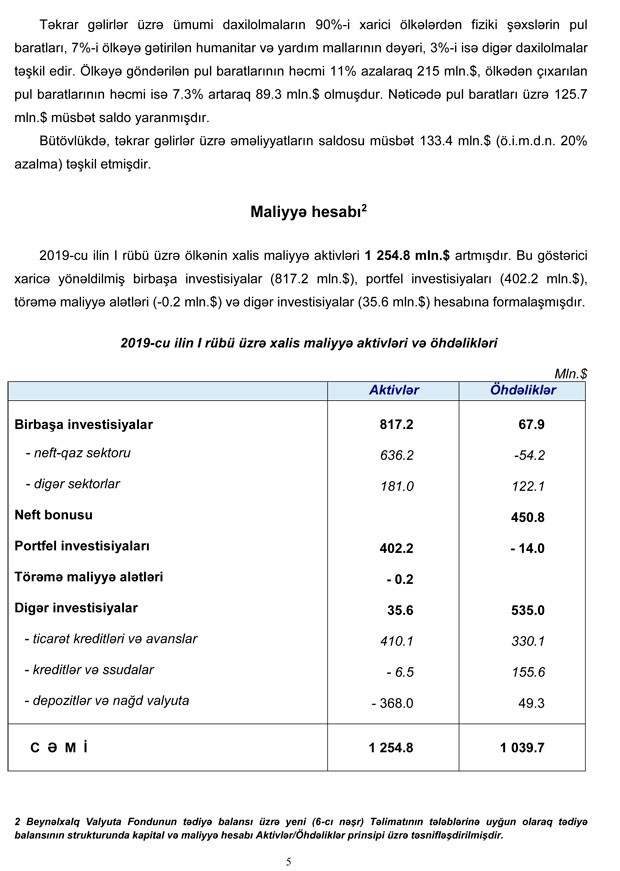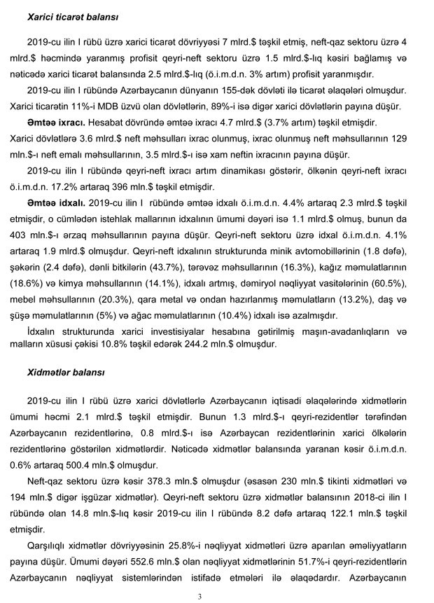 2019-cu ilin I rübü üzrə cari əməliyyatlar hesabında 1.6 mlrd.dollar (ötən ilə müvafiq dövrünə nəzərən (ö.i.m.d.n.) 3% artım) məbləğində profisit yaranmış, o cümlədən neft-qaz sektoru üzrə profisit ö.i.m.d.n. 4.6% (129 mln.dollar) artaraq 3 mlrd.dollar, qeyri-neft sektoru üzrə CƏB kəsiri isə 6.4% (82 mln.dollar) artaraq 1.4 mlrd.dollar məbləğində olmuşdur. Nəticədə cari hesabın neft-qaz sektorunun profisiti qeyri-neft sektoru üzrə kəsiri tam örtmüşdür",- Mərkəzi Bankın məlumatında deyilir.
