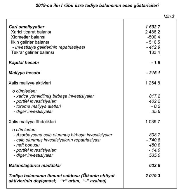 "Marja" xəbər verir ki, bu, 2019-cu ilin I rübü üzrə Azərbaycan Respublikasının tədiyyə balansında bildirilir.