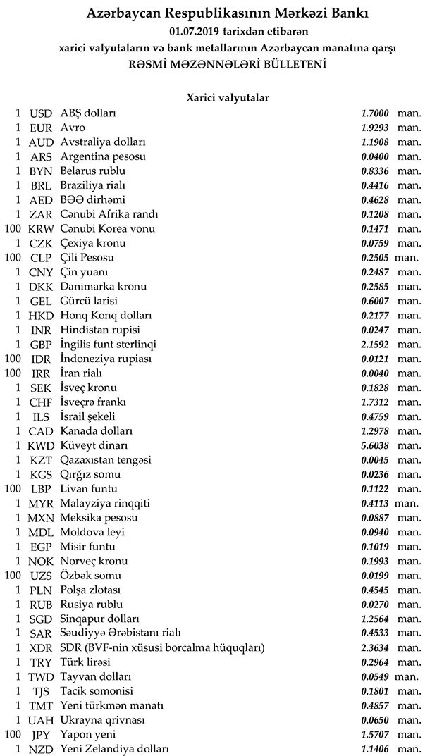 2019-cu ilin İyul ayının 1-nə Mərkəzi Bankın açıqladığı rəsmi Dollar/Manat məzənnəsi İyunun 28-i ilə müqayisədə dəyişməyərək 1,7000 manat olub, Avro/manat məzənnəsi 1.9293 manata düşüb, Rubl/manat məzənnəsi isə 0,0270 manata qalxıb.