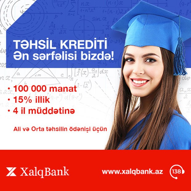 (®) ASC “Xalq” Bankının faizlərini endirdiyi kredit məhsullarından biri də “Təhsil” kreditidir. Hazırda bazarda olan təkliflər arasında ən aşağı faizlə verilən bu məhsul ödənişli əsaslarla yerli və yaxud xarici təhsil ocaqlarında oxuyan tələbə və şagirdlərə dəstək olacaq.