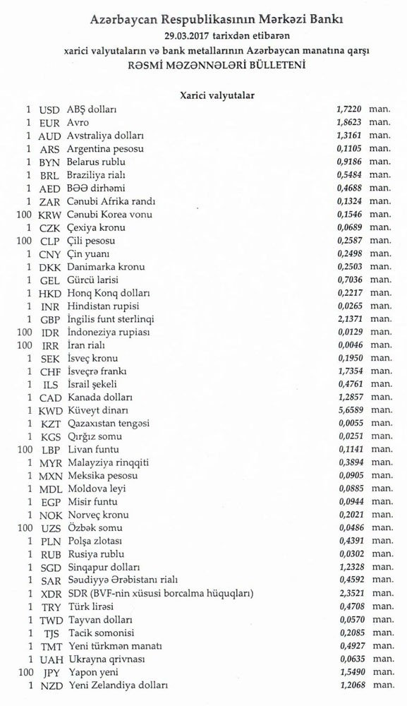 Martın 29-na Mərkəzi Bankın açıqladığı rəsmi Dollar/manat məzənnəsi Martın 28-i ilə müqayisədə qalxaraq 1,7220 manat olub, Avro/manat məzənnəsi isə 1.8623 manata düşüb.