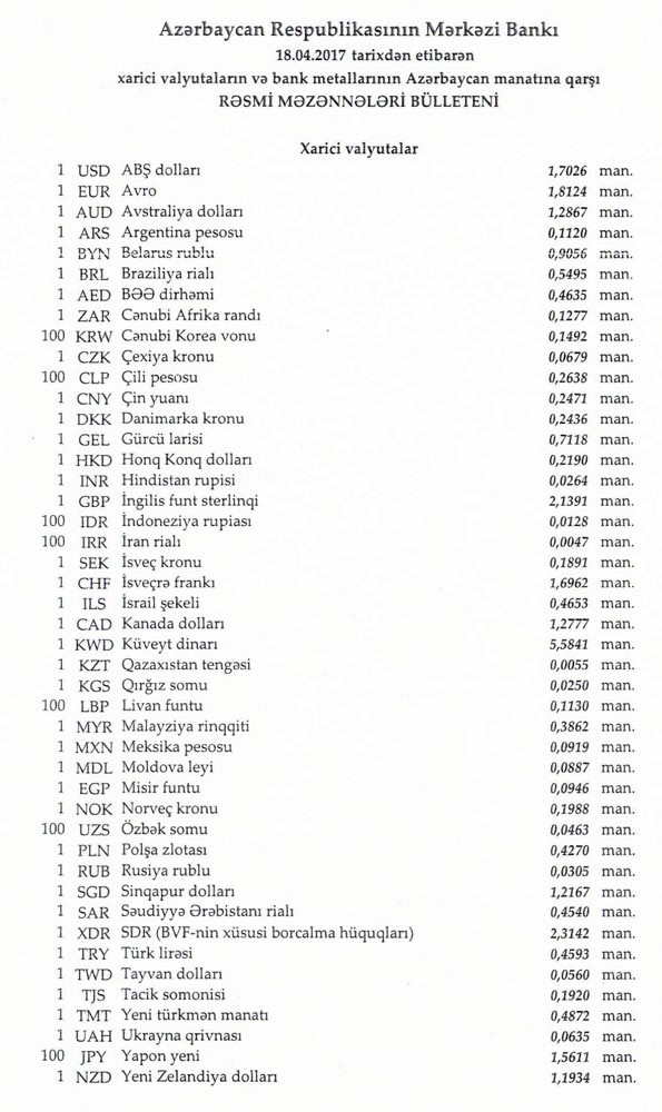 Aprelin 17-də rəsmi olaraq 1 dollar 1,7026 manata, 1 avro isə 1.8080 manata bərabər idi.