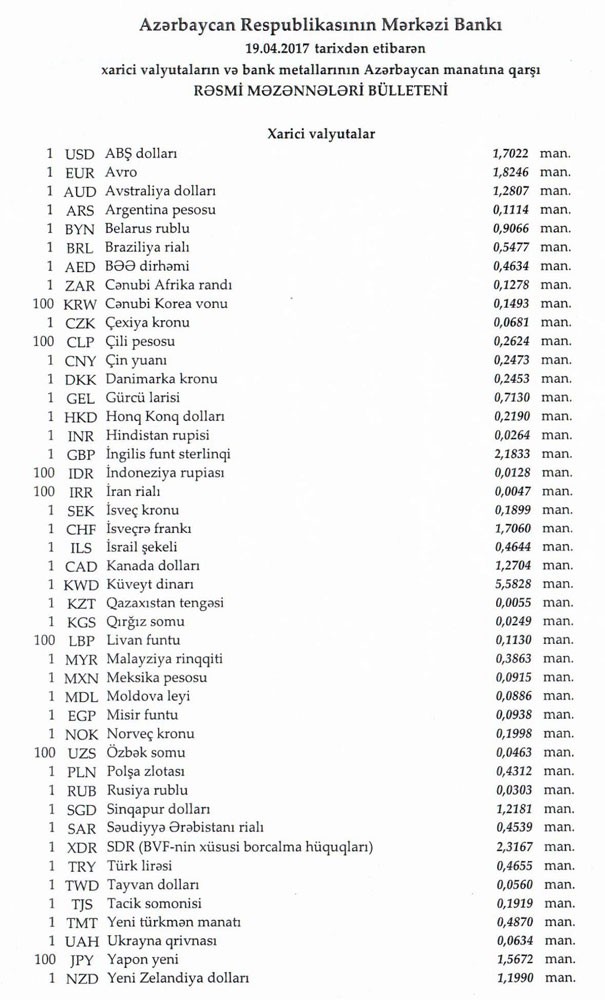 Aprelin 19-na Mərkəzi Bankın açıqladığı rəsmi Dollar/manat məzənnəsi Aprelin 18-i ilə müqayisədə düşərək 1,7022 manat olub, Avro/manat məzənnəsi isə 1.8246 manata qalxıb.