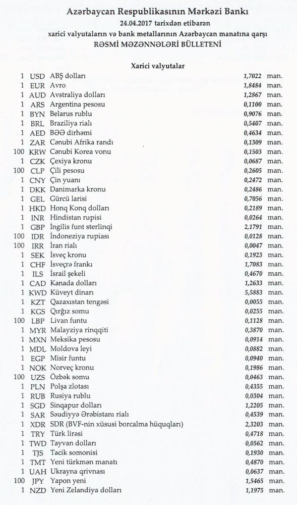 Aprelin 24-nə Mərkəzi Bankın açıqladığı rəsmi Dollar/manat məzənnəsi Aprelin 21-i ilə müqayisədə dəyişməyərək 1,7022 manat olub, Avro/manat məzənnəsi isə 1.8484 manata qalxıb.