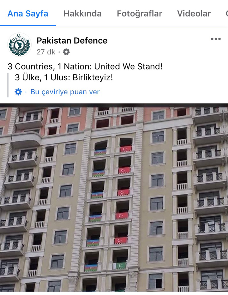 Qeyd edək ki, Pakistan Müdafiə Nazirliyi bu gün öz rəsmi facebook səhifəsində “3 ölkə, 1 millət, birlikdəyik!” başlığı ilə “Renessans Palace”-dakı möhtəşəm bayraq nümayişi haqqında paylaşım edib.
