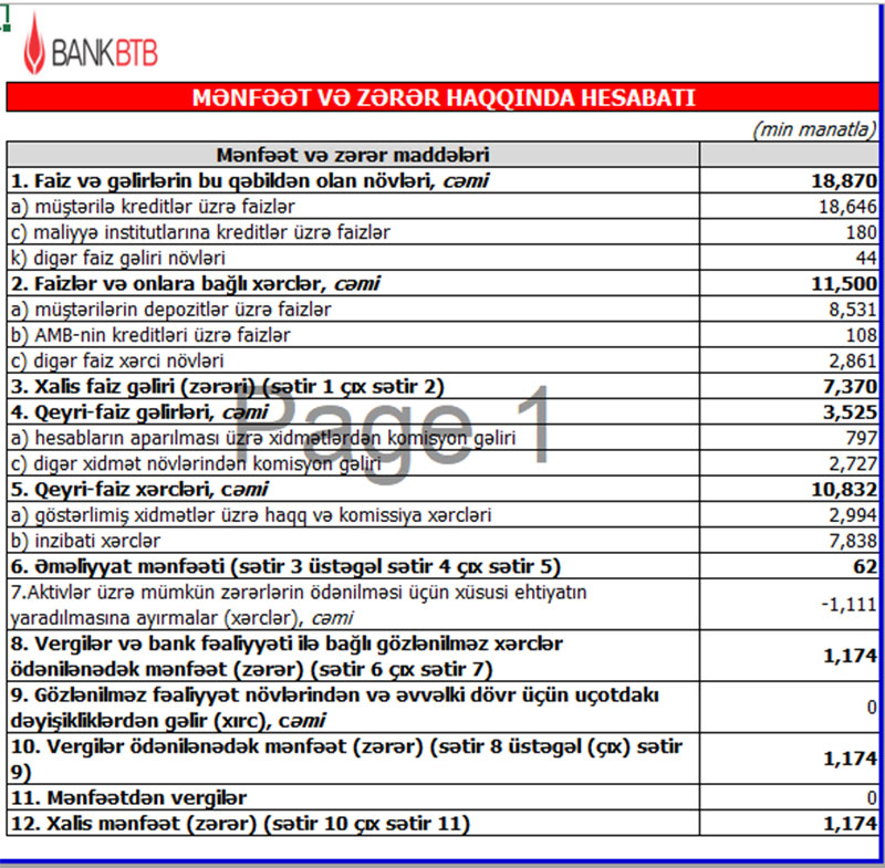 “Bank BTB” ASC 2021-ci ilin 9 ayını (yanvar-sentyabr dövrünü) 1 miylon 174 min manat xalis mənfəət ilə başa vurub. Bu, ötən ilin eyni dövrü ilə müqayisədə 2,7 dəfə çoxdur. “Bank BTB” 2020-ci ilin 9 ayını 442 min manat xalis mənfəət ilə bağlamışdı. Xalis mənfəətin artması aktivlər üzrə mümkün zərərlərin ödənilməsi üçün yaradılan xüsusi ehtiyatdan azad olmuş vəsaitin hesabınadır.