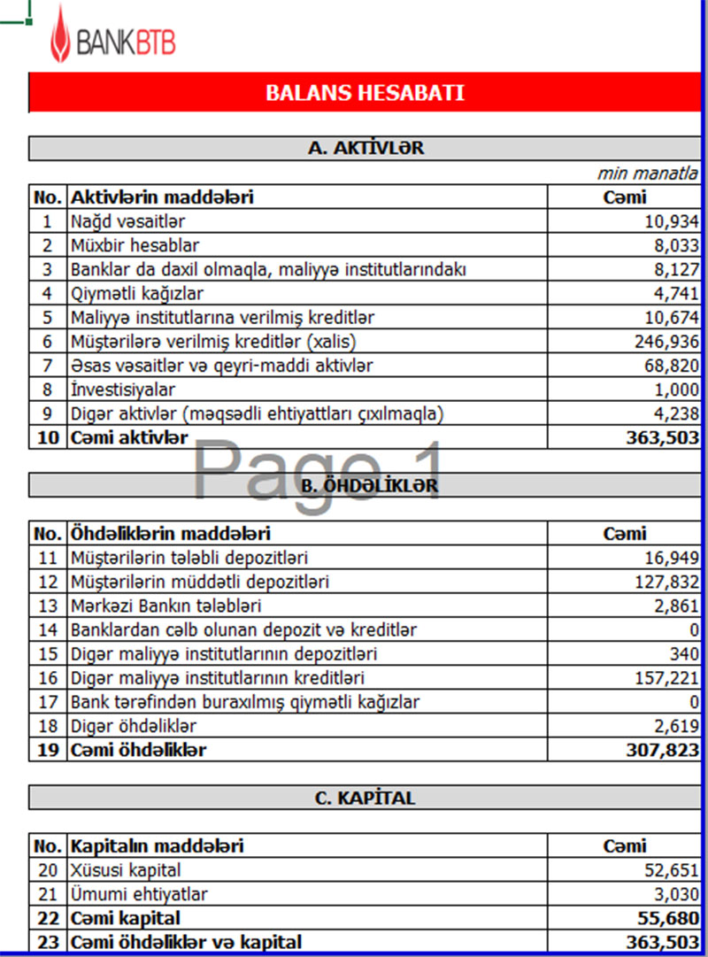 30 Sentyabr 2021-ci il tarixində "Bank BTB" 54 milyon 285 min manat məcmu kapitala malik olub. Ötən ilin sonunda Bankın məcmu kapitalı 52 milyon 727 min manat təşkil etmişdi.