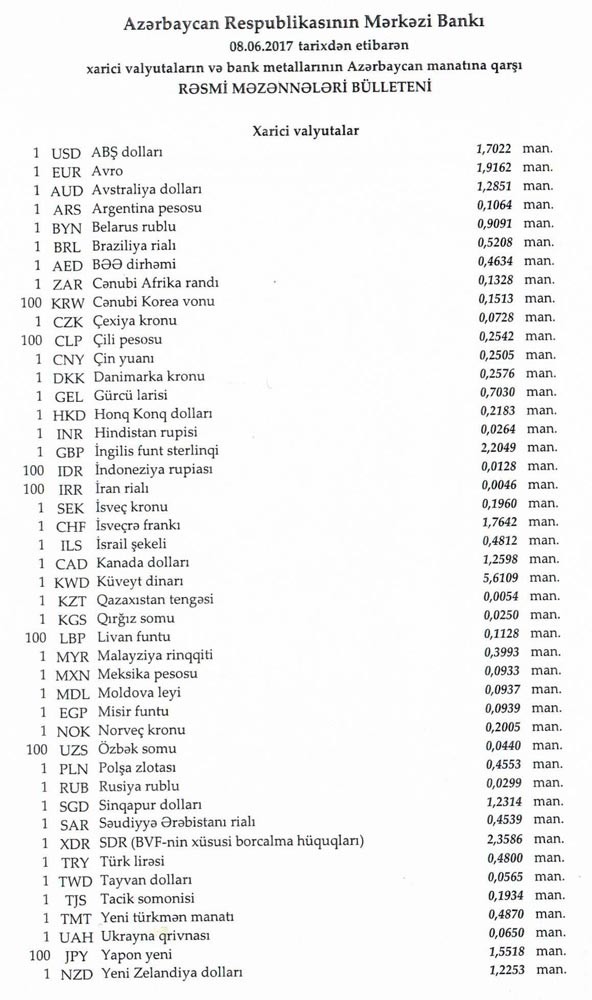 İyunun 7-də rəsmi olaraq 1 dollar 1,7022 manata, 1 avro isə 1.9194 manata bərabər idi.