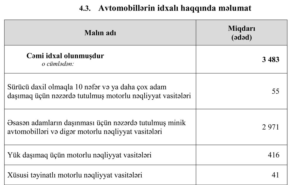 2017-ci ilin birinci yarısında Azərbaycana 3 483 ədəd nəqliyyat vasitəsi idxal olunmuşdur.